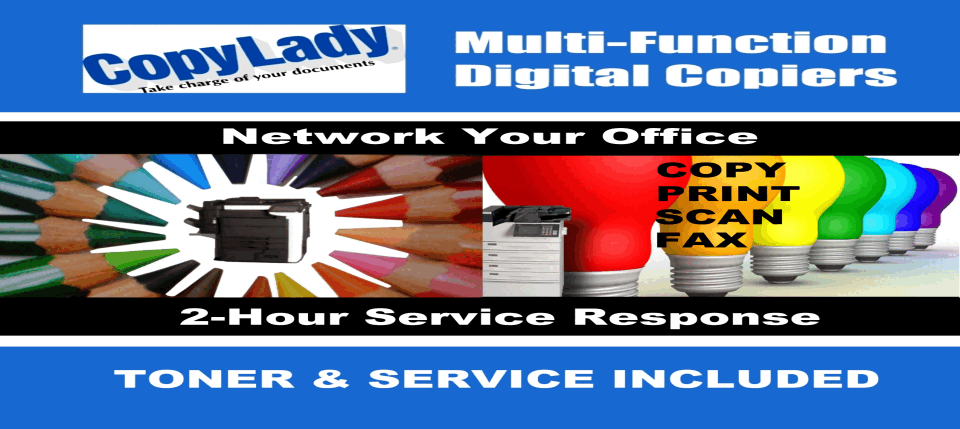 CopyLady: Proudly serving SouthWest Florida since 2002!Rent a CopyLady Copier today!Do you need a copier for just a little bit? Maybe for just one day, or even one year? CopyLady can help you!At CopyLady, We carry Multifunction Printers from major brands such as Epson, Kyocera, and KIP.No matter how long you need a copier for, whether it's one day, a week, a month, a year, or more, We got you covered!At CopyLady, we ensure that the quality goes IN, before the name goes ON!Whether you rent, lease or own your copier, you still get the same amazing service!That's right! Just like our clients who lease or own their copiers, renters also benefit from the CopyLady 2-Hour response guarantee!We are the ONLY dealer in the WORLD to offer service this fast! No matter what help you need, or what the issue with your machine is,We will be there within 2 hours of you calling us! Our highly trained technicians are fully certified, and ready to help get your machine up andrunning again! In many cases, we can help you solve your issues over the phone without a technician coming to visit! Our highly skilled help desktechnicians can solve just about any issue, big or small, during your phone call to us. If we can't fix it here, we'll fix it there within TWO HOURS!You provide the paper, we provide the supplies!No matter the duration of your rental, your copier still comes with the same great CopyLady service agreement, which comes with the necessary supplies for your machine!What's better, is thanks to our revolutionary Toner Replenishment System (TRS), You'll NEVER have to call and order toners! We'll handle it all for you!Once we see you are low on a toner, One of our technicians will bring a fresh one out to you! We carry a full selection of toners and inks in our Fort Myerswarehouse, No need to wait for it to come from some other state! And yes, It's FREE!!!Need a BIG PRINTER?........We rent those too!Blueprints? Posters? Banners? Mapping out your underground bunker? Rent a CopyLady plotter today!With sizes up to 44 inches, Let your creativity soar! Razor sharp Black & White, and Colors so real, You'd think it was an art piece!Ready to rent an amazing copier or printer? Call us at 239-939-5383!Don't settle for the least, Go for the best! Like what you see? Call now or check out our specials!Call CopyLady Today at 239-939-5383 Serving Southwest Florida since 2002.